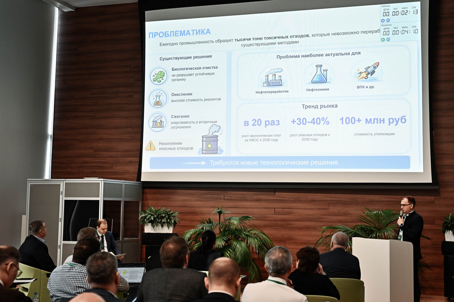 В экологическом блоке проходила защита 11 проектов. Одним из основных направлений представленных разработок стали новые технологии очистки сточных вод. В частности, была презентована система автоматического контроля сбросов, которая непрерывно мониторит уровень концентрации загрязняющих веществ при очистке стоков и по мере его повышения позволяет организовать работу по оперативной реагентной корректировке.